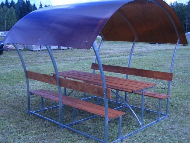 Верх покрывается сотовым поликарбонатом (в комплект он не входит). Столешница и лавки изготовлены из обрезной доски. В комплект входит вся необходимая фурнитура. Вместительность беседок – до 8 человек.