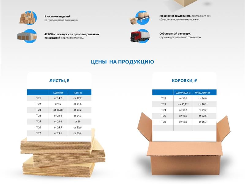 Собственное производство гофрокартона и гофрокоробов с доставкой со складов Москвы и Санкт-Петербурга. Цены ниже рынка на 22%за счёт собственного производства. 5 производственных линий для упаковки. 156 готовых макетов гофрокоробов под любые товары. Только за 2018-2019 года поставили 1080 20-ти тонных фур. Производительность фабрики 21 млн. кв. метров.