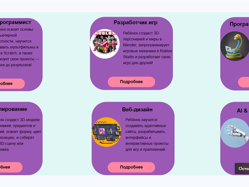 Преподаваемые предметы: Scratch, Roblox Studio, Python, 3D, Veb-design. AI