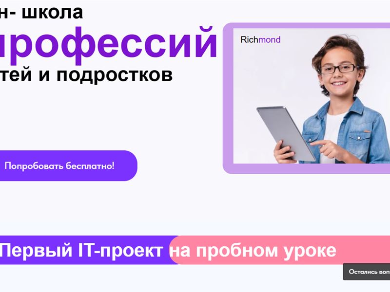 Детская онлайн школа Richmond, приглашает на первый ознакомительный урок (бесплатный), на нём проводим профориентацию, определяем направление интересное и полезное конкретному ребёнку и обязательно ребёнок самостоятельно делает практику, даём обратную связь родителю и отвечаем на все возникающие вопросы, и преподаватель озвучивает свои рекомендации, с какого направления лучше начать занятия и с какого объёма занятий (подробнее на уроке).