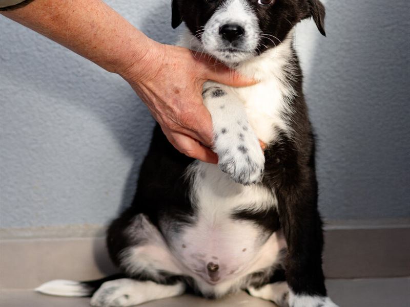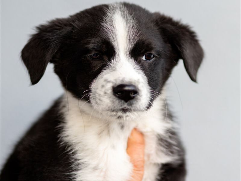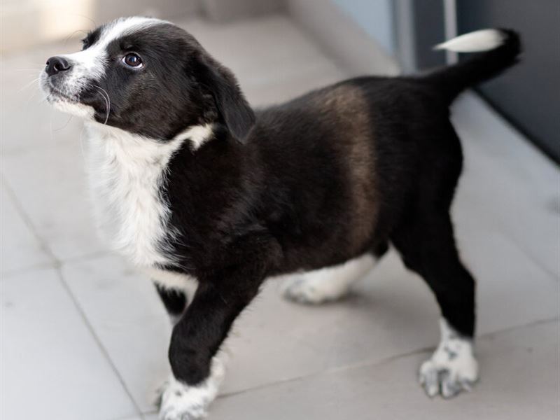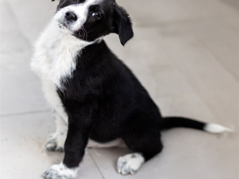 Кроха - Чижик. Он весит сейчас примерно 4 кг. ему не больше 2- месяцев. Мальчик. Очень симпатичной расцветки. Белый с черным. Скорее всего будет крупным (в районе 20 кг), но не гигантом. Привит, здоров, жизнерадостен, не пуглив. Очень стремится к общению с человеком. Классный малец!