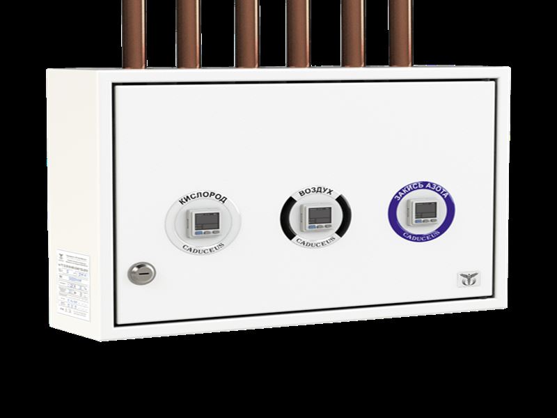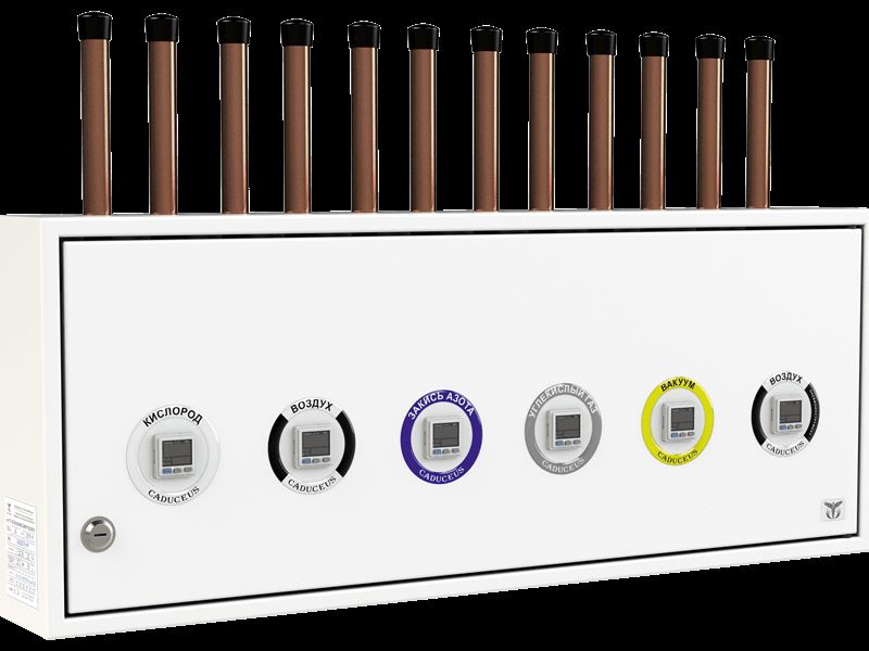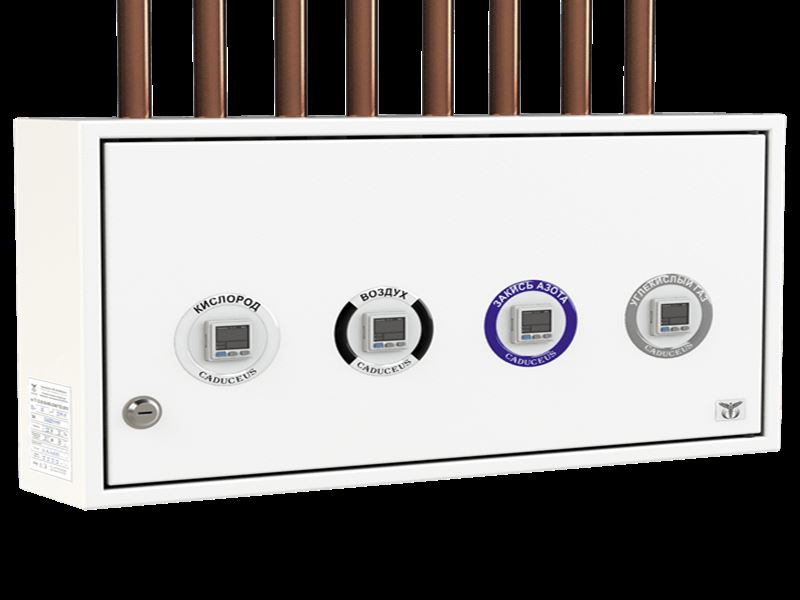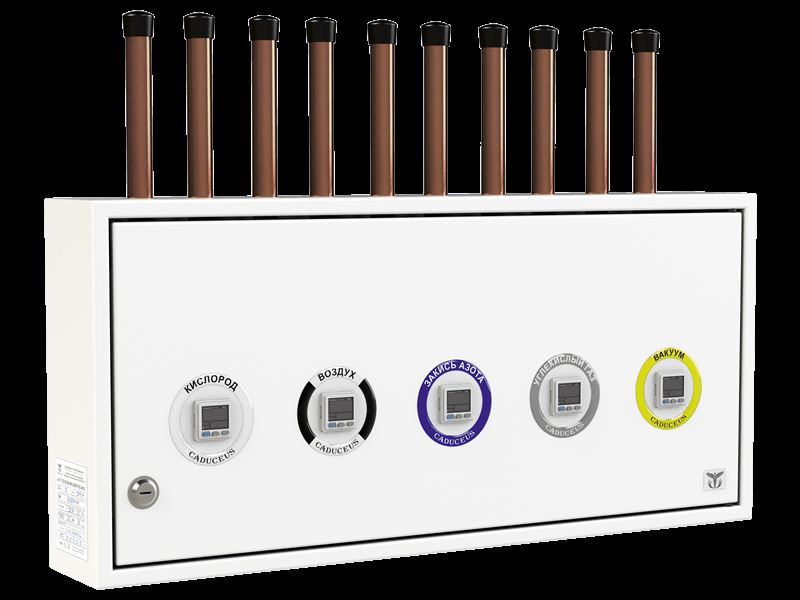 Контрольно-запорные устройства для медицинских газов российского производства Кадуцей (Caduceus) SU-1S, SU-2S, SU-3S, SU-4S, SU-5S и SU-6S с семисегментными индикаторами и системой сигнализации.
