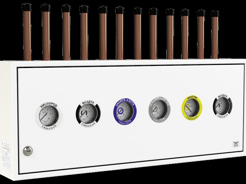 Контрольно-запорные устройства для медицинских газов российского производства Кадуцей (Caduceus) SU-1, SU-2, SU-3, SU-4, SU-5 и SU-6 с механическими манометрами.